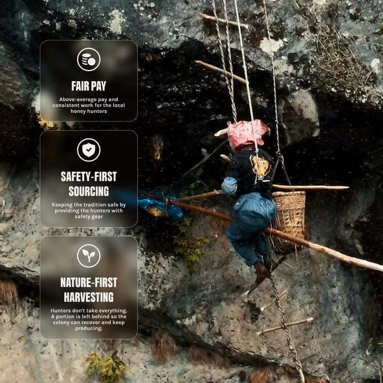 A rare wild honey harvested high by hand in the Himalayas, used for centuries for its rich flavor, and unique natural effects. Limited supply, unmatched flavor.