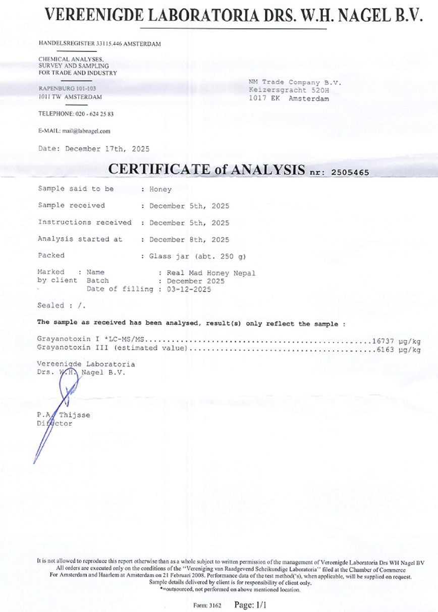 Real Mad Honey is real, raw honey that naturally contains trace grayanotoxins (GTX) because bees forage on certain wild rhododendron flowers in specific mountain regions (mainly Nepal and parts of Turkey). That’s what makes the experience different from regular honey.