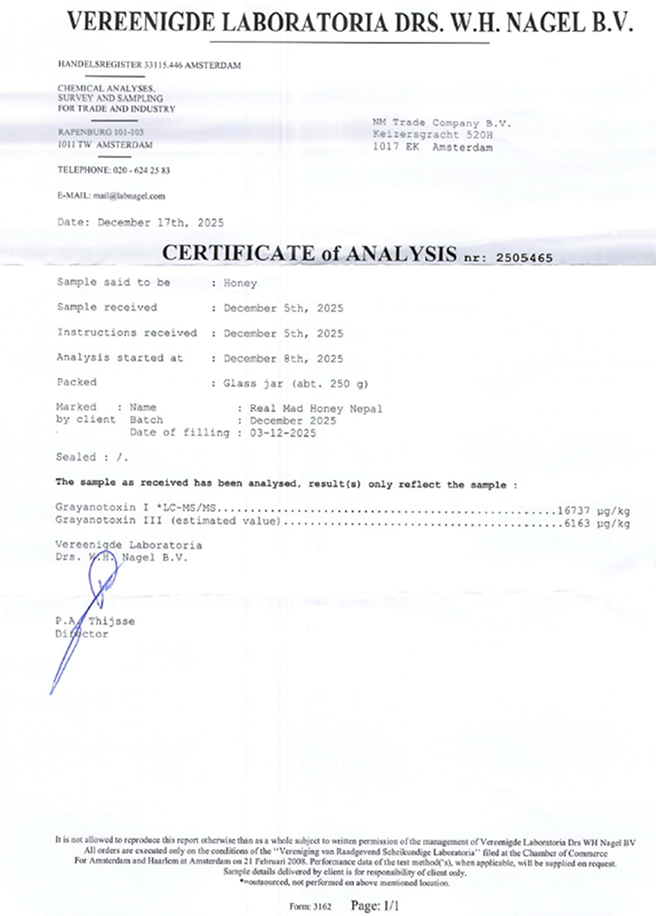 Real Mad Honey is real, raw honey that naturally contains trace grayanotoxins (GTX) because bees forage on certain wild rhododendron flowers in specific mountain regions (mainly Nepal and parts of Turkey). That’s what makes the experience different from regular honey.