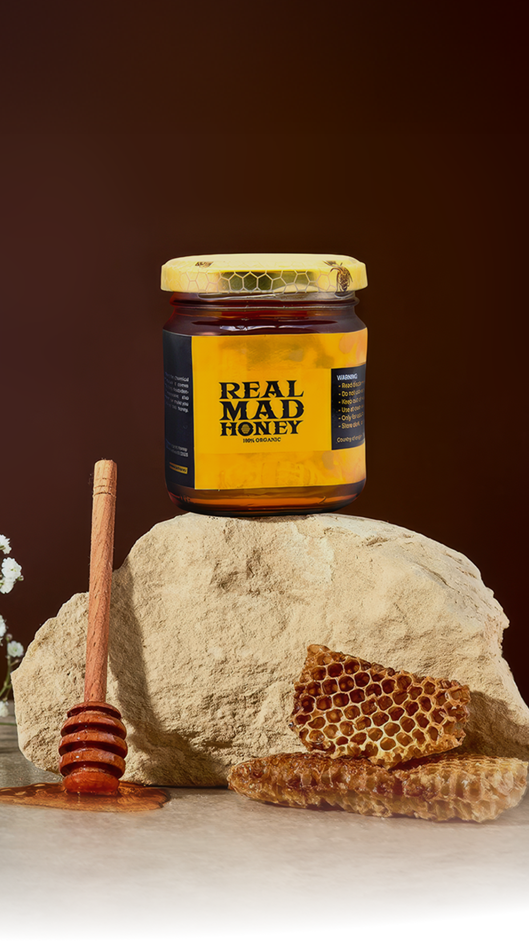 Real Mad Honey 100% натуральным и уникальным. После того, как он добыт нашими опытными пчеловодами, он не подвергается никакой дополнительной обработке. В него не добавляются никакие добавки, то есть он остается нефильтрованным и готовым к употреблению.